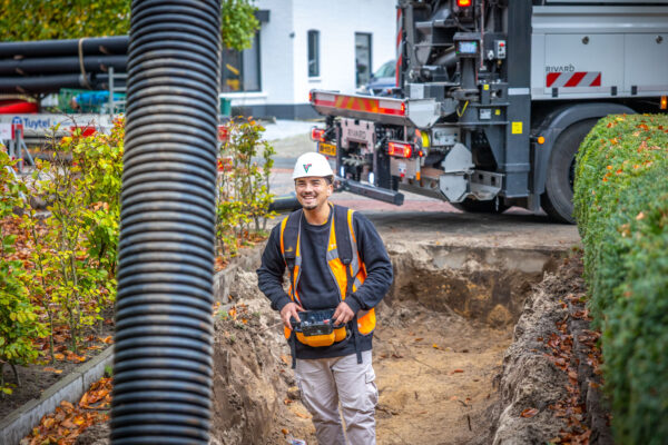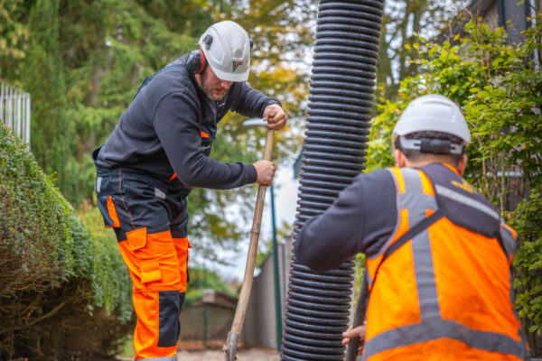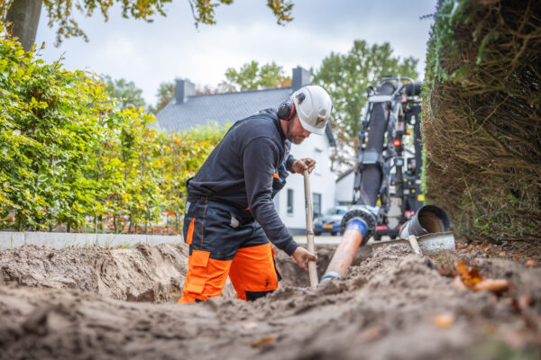 Werken met een graafmachine in een smalle brandgang is lastig. Ook is het een uitdaging om de uitkomende grond af te voeren uit de brandgang. Daarom gebruiken we een zuigwagen. ‘Met de zuigwagen werken we schoon en veilig,’ legt Ryan uit. ‘Zo voorkomen we schade aan kabels en leidingen en de omgeving blijft netjes.’