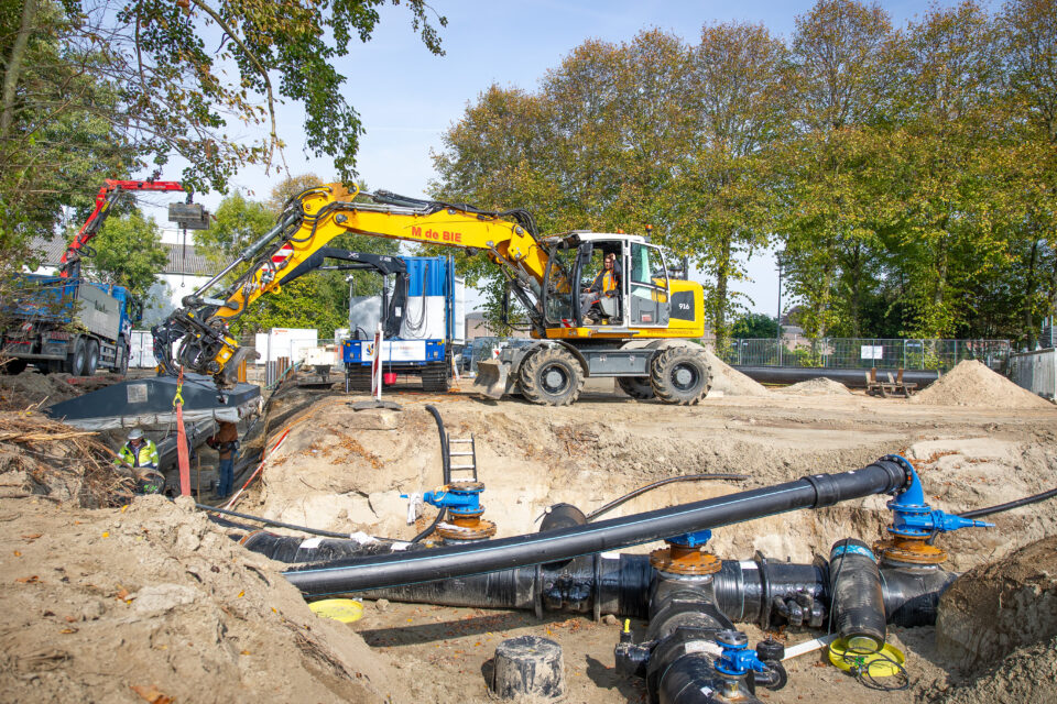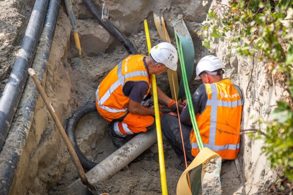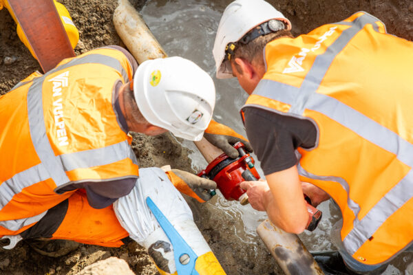 Stap 1 – Aan de noordkant van het spoor bouwen we eerst een koppelpunt. Daarmee kunnen we delen van het netwerk tijdelijk afsluiten zonder dat bijvoorbeeld Goes zonder water komt te zitten. In de Dijkwelseweg halen we een oud stuk asbestcement en betonriool weg. Zo ontstaat ruimte voor de nieuwe DN800-transportleiding.