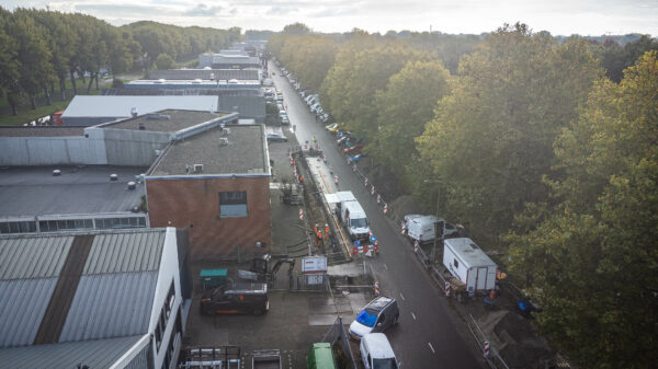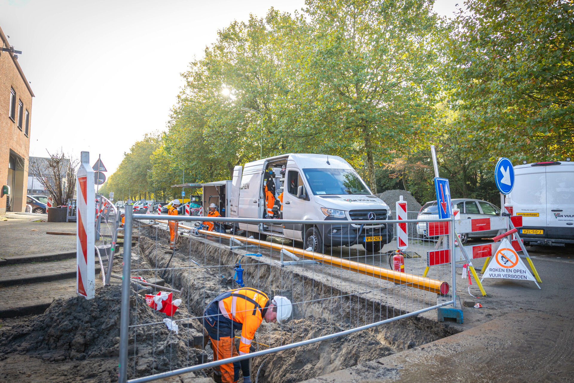 Molenvliet is druk en voelt soms zelfs als een racebaan. Daarom staan er 3 verkeersregelaars, aan de kopse kanten ieder 1 en 1 in het midden van het werkvak. Die houdt contact met de mobiele kraan, die buiten de afzetting rijdt om materiaal aan te voeren. ‘Na werktijd zetten we alle sleuven vierkant af met bouwhekken,’ bedrukken Christiaan en Pim. ‘Er blijft geen centimeter open.’